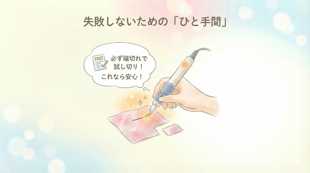 本番の布を切る前に、必ず端切れで「試し切り」をしてください。