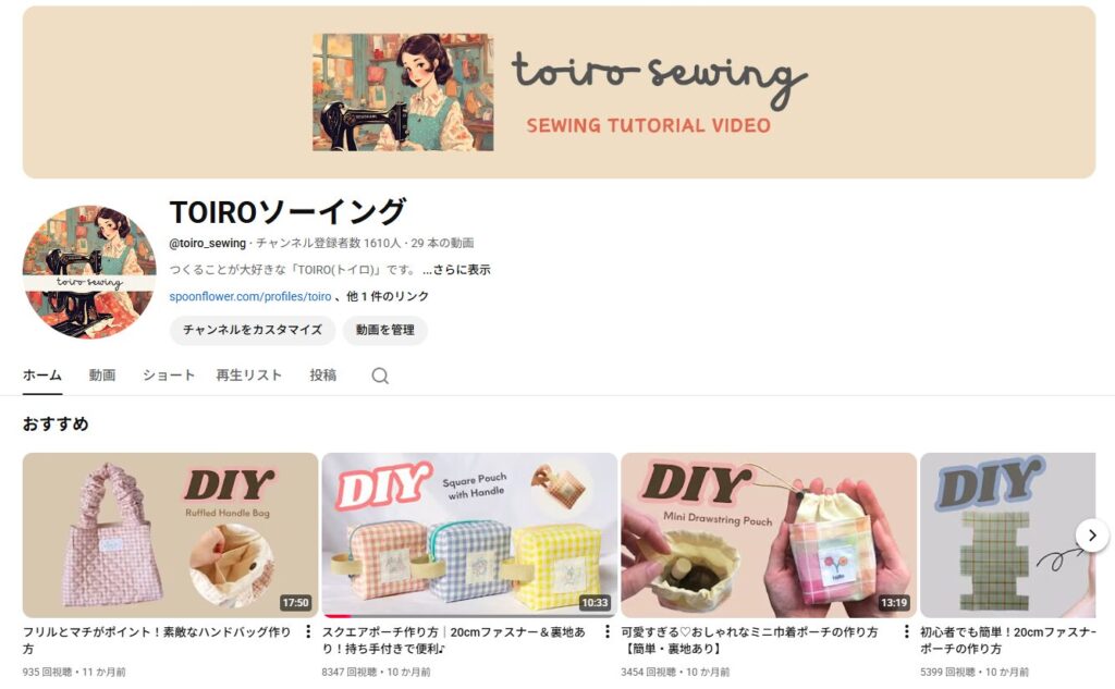 この他にも、YouTubeではトートバッグや巾着など、たくさんの布小物レシピを配信しています。