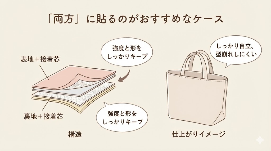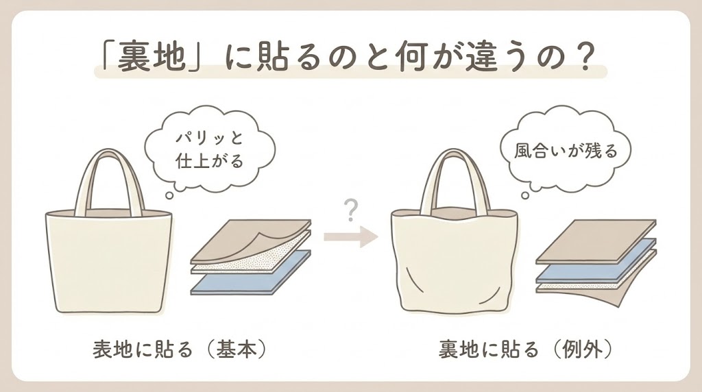 特に、トートバッグやレッスンバッグのように、しっかり自立させたいアイテムの場合は、表地に貼るのが「失敗しない近道」です。