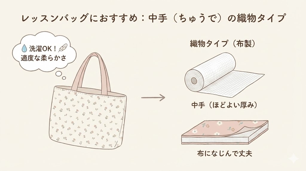 - 用途で種類を使い分ける:洗濯するレッスンバッグは織物タイプ、自立させたいトートバッグは不織布タイプがおすすめです。