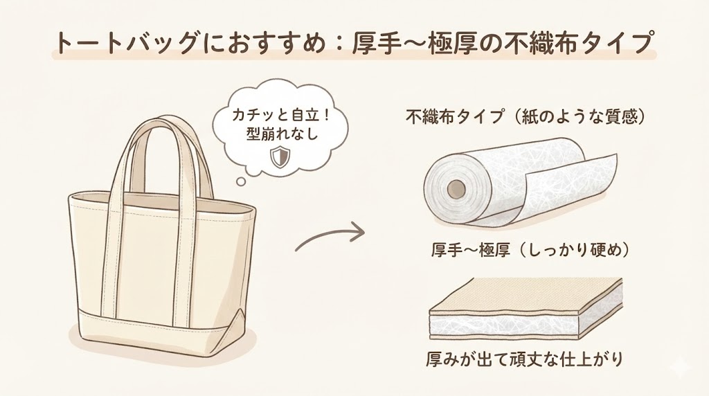 シャキッと自立するトートバッグを作りたいなら、「厚手」の不織布(ふしょくふ)タイプを選んでみてください。