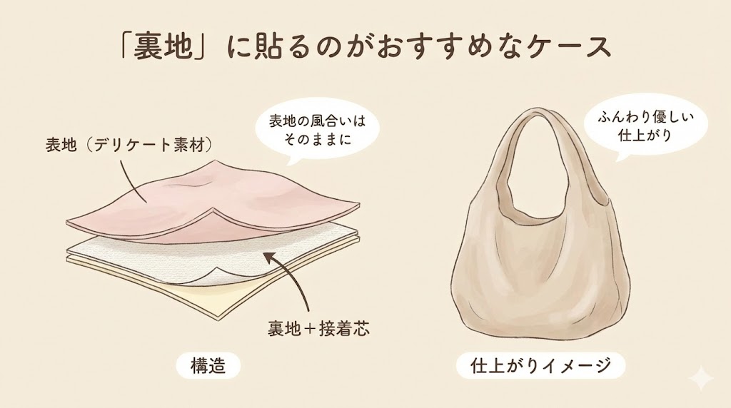 - 「裏地」に貼るのは風合い重視のとき:デリケートな生地や柔らかさを出したい場合に有効です。