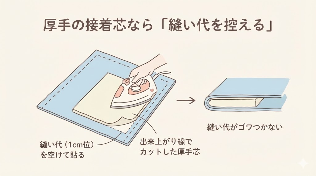 厚手の接着芯なら「縫い代を控える」