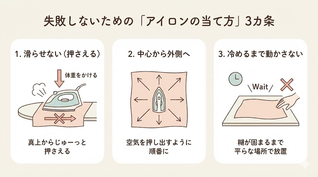 - 「冷めるまで」動かさないこれが一番大事!熱い状態で動かすと、せっかく溶けた糊が剥がれてしまいます。しっかり冷めて糊が固まるまで、平らな場所で放置しましょう。