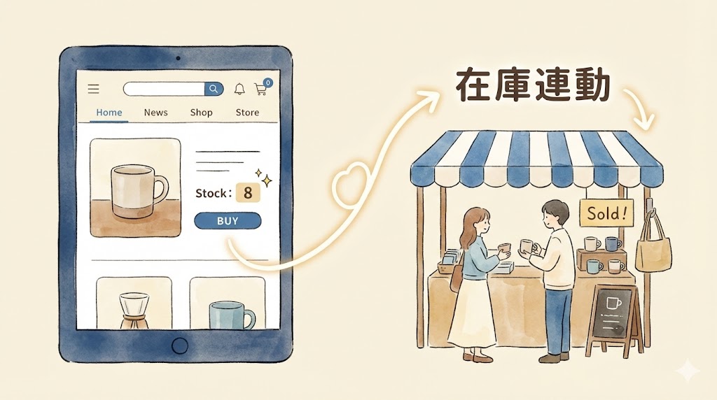 STORESなら、無料のレジアプリを使うことで、イベント会場で会計した瞬間にネットショップの在庫も自動で「SOLD OUT」になります。