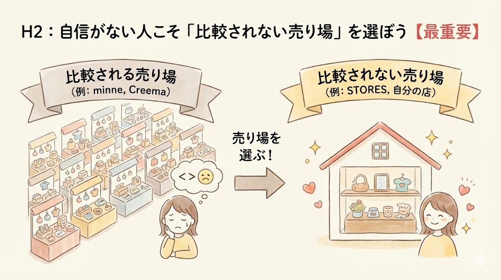 • 自信がない人への戦略 比較されるminneなどではなく、自分の世界観を守れる「STORES」などで小さく始める。