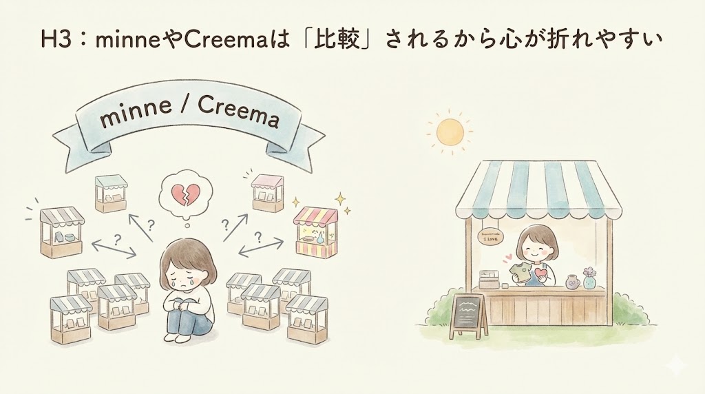 これは、大型ショッピングモール(minne)の一角に出店するのではなく、路地裏に「自分だけの小さなお店」を構えるようなイメージです。
