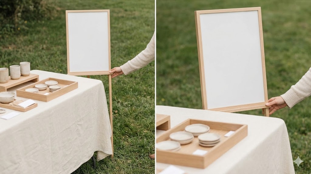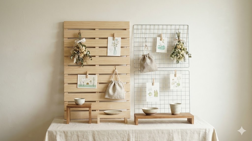 折りたたみ式のアイアンスタンドや、自立するメッシュパネルなら、「マルシェ ディスプレイ 折りたたみ」の利便性を活かしつつ、視線の高い位置に看板やメイン商品を配置できます。