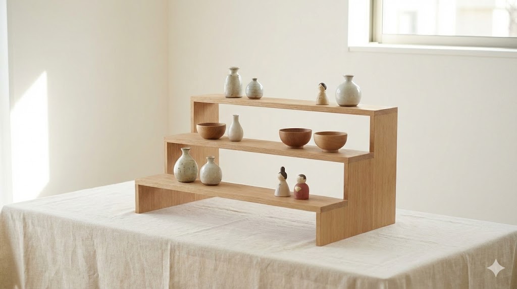 什器を新調しなくても、同じ高さの箱や芯材を土台にして、その上に板を渡すだけで立派な「ひな壇」が作れます。