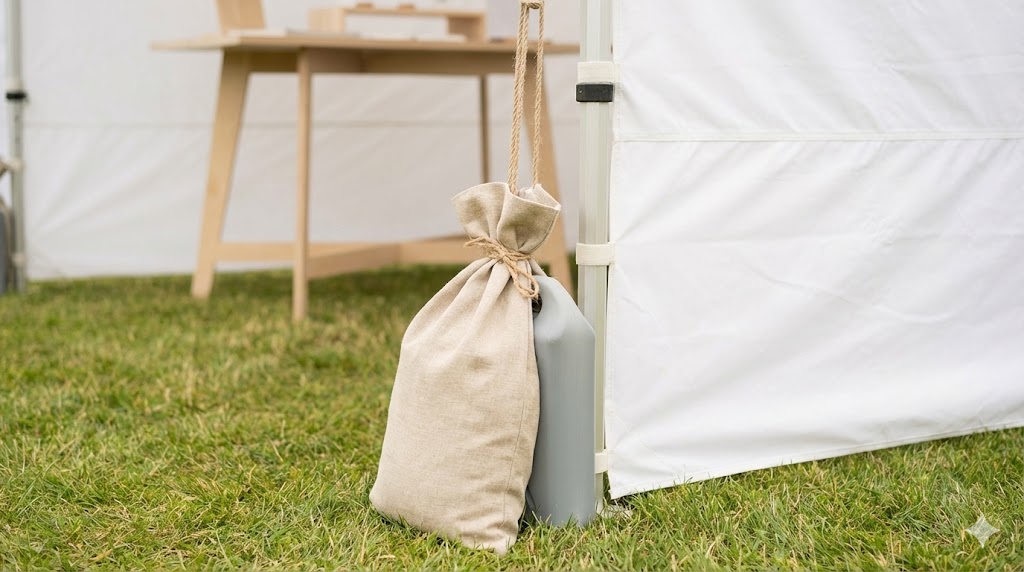 テントの脚や、自立する背の高い什器には、必ずウエイト(重し)を使いましょう。