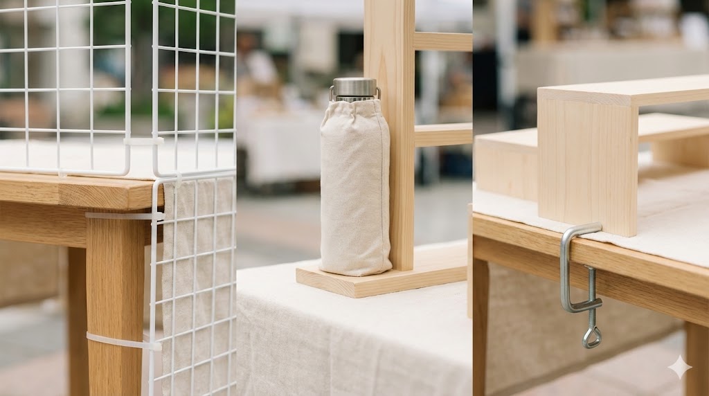 特に屋外イベントでは、突風で什器が倒れて作品が破損したり、お客様にケガをさせてしまったりするリスクがあります。