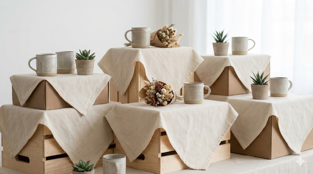 作品を運んできた梱包箱を布で隠して土台に転用するのも、ベテラン作家さんがよく使う賢いテクニックです。