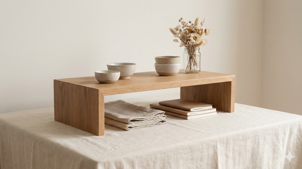 幅50cm×奥行19.5cm×高さ9cmというサイズ感が絶妙で、テーブルの上に置くだけで「9cmの段差」が簡単に作れます。