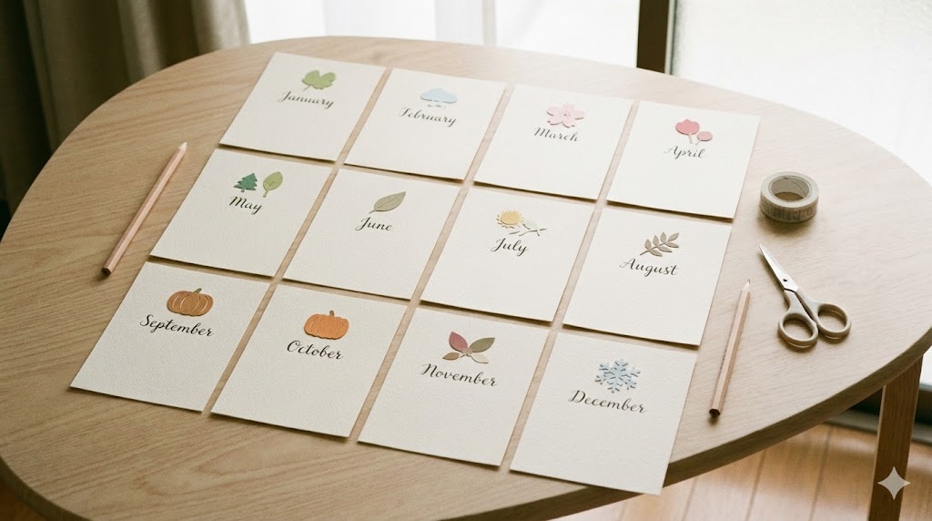 | 2月 | バレンタイン・送別準備 | ギフトタグ、ラッピング、寄せ書き台紙 | 12〜1月 |