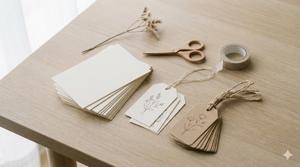 - 通年商品で底上げする:季節を問わない「コラージュ素材」「サンキュータグ」「誕生日カード」をつねに並べておく